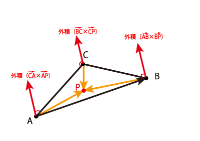この性質を利用して、3つの外積ベクトルの向きを比較すると、三角形の内外判定ができます。
